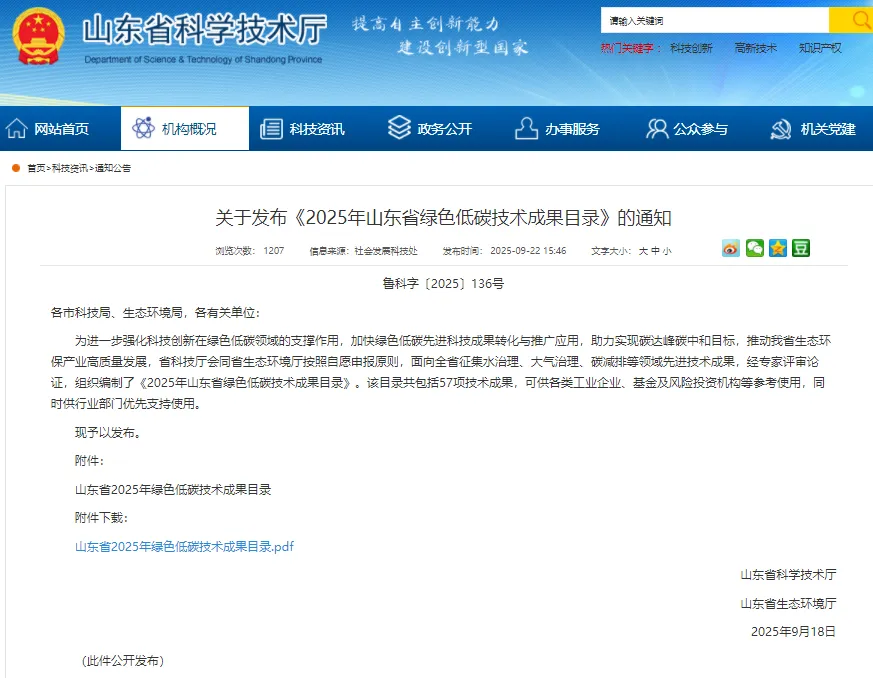 18 сентября 2025 года Департамент науки и технологий провинции Шаньдун и Департамент экологии и окружающей среды провинции Шаньдун совместно выпустили Каталог достижений в области зеленых и низкоуглеродных технологий провинции Шаньдун (2025). Технология очистки воды с помощью мембранного аэрированного биопленочного реактора (MABR), самостоятельно разработанная компанией Tianjin Haizhihuang Technology Co., Ltd., была успешно включена в этот каталог! Эта технология, признанная за свою инновационность и значительный эффект сокращения выбросов, была определена как одна из 57 ключевых зеленых и низкоуглеродных технологий, подлежащих продвижению в провинции Шаньдун.